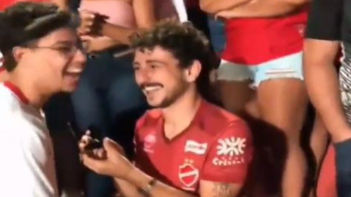 A cena foi filmada e viralizou nas redes sociais com o pedido de casamento, que termina com o outro companheiro dizendo sim e beijando o companheiro.#Registro📸 Pedido de casamento ontem o meio da torcida do Vila, durante a partida contra o Criciuma. #OamorVenceu pic.twitter.com/5ng9DIcZnt— ETTORCIDA💎 (@ettorcidamemo) May 13, 2023