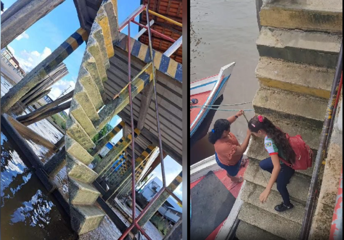 Andresa é mãe de um aluno de ensino fundamental da rede pública que necessita pegar todos os dias o barco no local. A escada está com rachaduras em três partes. O problema teria ocorrido quando uma balsa bateu no local.