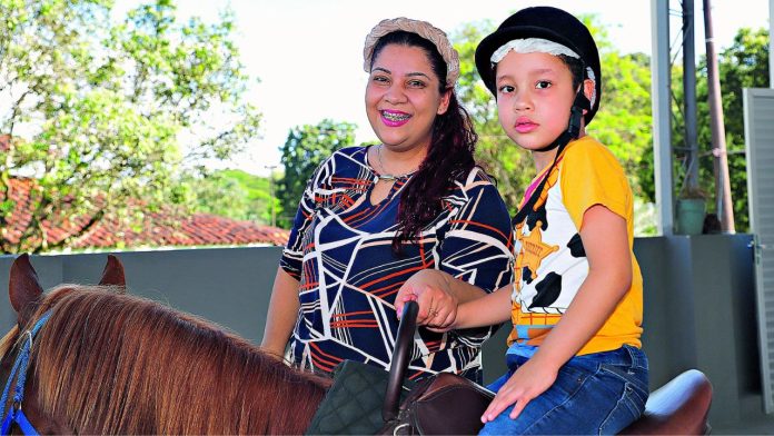 Os momentos agradáveis que o pequeno Erlan Monteiro Carvalho, 6 anos, vivencia durante o atendimento da equoterapia ficam estampados em sua expressão assim que ele começa a preparação, com o uso dos equipamentos de segurança, para subir no cavalo. Desde que ele iniciou o método terapêutico, há um ano, já se observam melhorias em relação ao equilíbrio e à concentração, além do grande prazer que ele tem de ir para as sessões. “Ele é uma criança com Transtorno do Espectro Autista (TEA) e Transtorno de Déficit de Atenção com Hiperatividade (TDAH) e depois que ele começou a fazer a equoterapia melhorou bastante a questão do equilíbrio, além da coordenação motora, do raciocínio lógico, da questão tátil, da aproximação com os animais, ele desenvolveu habilidades”, considera a mãe de Erlan, Eliane Monteiro Carvalho.