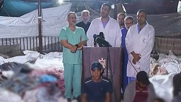 Médicos do Hospital Al-Ahli em Gaza fizeram uma coletiva de imprensa nas instalações do hospital, cercados pelos corpos das vítimas após o bombardeio que atingiu o local na terça-feira (17), deixando, pelo menos, 500 pessoas mortas.O hospital abrigava milhares de civis que buscavam tratamento médico e refúgio contra os ataques israelenses.Conteúdos relacionados:70 anos de tensão: o conflito entre Israel e a Palestina Vídeo: Israel mata mais de 500 em ataque a hospital em Gaza “Isso é um sinal que o mundo não caminhará em direção à paz”, disse o porta-voz.Quer ver mais notícias do mundo? Acesse nosso perfil no WhatsApp.Essa cena entrará para a história como uma das mais simbólicas do GENOCÍDIO PALESTINO.Médicos do hospital Al Ahli Arab (Gaza Baptist Hospital) em entrevista coletiva em meio aos mortos do bombardeio assassino de “israel”.pic.twitter.com/lolxfHn5gT— FEPAL – Federação Árabe Palestina do Brasil (@FepalB) October 17, 2023 Desde o início dos conflitos, aproximadamente 3.000 palestinosforam mortos na Faixa de Gaza, resultante de uma escalada de tensão que se iniciou em 7 de outubro, quando o Hamas lançou um ataque em solo israelense que matou mais de 1.400 vítimas.