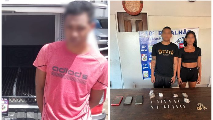 Policiais militares do 10º Batalhão desmontaram um ponto de drogas e ainda prenderam duas pessoas por tráfico de entorpecentes na tarde desta terça-feira (30). As drogas foram apreendidas no distrito de Icoaraci, em Belém.Militares que faziam rondas pela área abordaram um usuário de drogas, que confessou ter comprado certa quantidade de entorpecentes em uma boca de fumo. O homem indicou o endereço do local, que fica na 5ª Rua, com a Berredos, no bairro Cruzeiro.Ao chegar na residência, os PMs prenderam em flagrante o suspeito identificado como Welington, dono do negócio criminoso na área. Também foi realizada a prisão de Layane, companheira de Welington, que era responsável por distribuir as drogas na localidade. Após averiguação, a guarnição constatou que Welington já tem passagem na Polícia por tráfico de drogas. Ele e Layane foram encaminhados para a delegacia e agora estão à disposição da Justiça.Traficante Kenney é presoMais cedo, por volta das 10h30, o 10º Batalhão teve mais um êxito no combate ao tráfico de drogas, desta vez, prendendo o criminoso conhecido como Kennedy, que estava foragido do sistema prisional.Após receber denúncias, os miliares fizeram um cerco policial para conseguir capturar Kennedy, que tentou fugir para uma área de matagal de difícil acesso, no bairro da Campina. O criminoso não obteve sucesso e foi preso.Com o suspeito, os policiais encontraram uma sacola contendo 46 embrulhos de maconha, 15 unidades de pasta base de cocaína e sete de skunk. Kennedy já tinha sido preso por tráfico de drogas e inclusive estava utilizando uma tornozeleira eletrônica, que ele desligou para tentar fugir.VEJA TAMBÉM:  Polícia desmonta ponto de tráfico de drogas em Mosqueiro