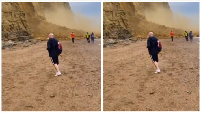 Um grupo de banhistas quase sofreu um grave acidente em West Bay, na Inglaterra, a 231 km de Londres. Parte de uma falésia de 45 metros de altura, desmoronou e por pouco não atingiu as pessoas que estavam na praia, que é uma das mais populares do país.Alguns banhistas tiravam foto próximo do local no momento do desmoronamento. Imagens divulgadas nas redes sociais mostram o momento em que parte da falésia desmoronou, na última terça-feira (08). Alguns banhistas tiravam foto, próximo do local, no momento do desmoronamento.No vídeo é possível perceber os banhistas correndo desesperados para longe da falésia.Veja o vídeoSegundo o jornal britânico The Sun, essa falésia é conhecida como Golden Gateway e se estende por 154 quilômetros da costa inglesa, sendo um destino popular de turistas.Logo após o desmoronamento de parte da falésia, guardas florestais interditaram a área. A expectativa é que o local fique proibido de receber banhistas pelos próximos seis meses.