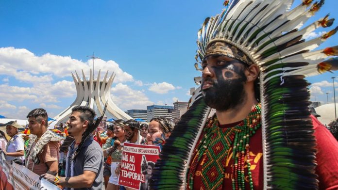 Para acompanhar o julgamento no STF, indígenas estão mobilizados em Brasília. Eles também se manifestam contra a tentativa do Senado de legalizar o marco temporal.
